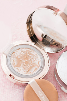 主打内外保湿品牌,6大功效:润饰、保湿、舒缓、美白、防晒、抗汗一 次到位!气垫粉粒吸附汗水与油脂,令妆容持久服帖,保湿,不服粉, 遮瑕效果也不错,光看外表就抑制不住买买买的冲动,少女心十足。