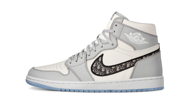 鞋款采用意大利最高制造技术,以精选小牛皮制成,代表了 Maison Dior的皮具生产造诣。鞋身由乳白色和迪奥灰( Dior Gray)拼接组成,自1947年成立以来,颜色一直是Maison dior的代名词。标志性的混合鞋帮上印有 Jumpman Wings徽标,并标有"AIR DIOR"字样,同时配有一个 Jumpman吊坠。 Nike swoosh以及鞋舌采用 Dior oblique提花制成,单个图案同时代表着两个行业的领导者;水晶大底上分别印有Dior字样以及Jumpman Wings徽标以彰显球鞋的身份。