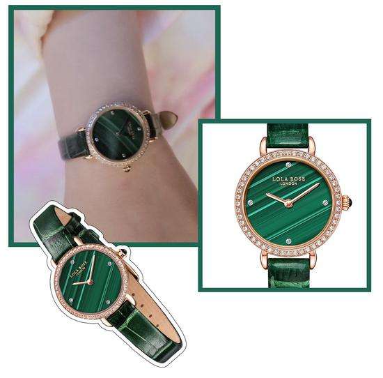 LolaRose手表的设计非常淑女范儿,设计非常有特点,五彩斑斓的矿物质为表镜,表耳镶嵌宝石,并且都是手工打造。 孔雀石、虎眼石、大理石,挑得眼花缭乱。在设计上,她突破了传统的设计理念,充分利用珠宝材料,将多彩的天然宝石融入手表中,从而创造出一款英国复古、全面的彩色宝石手表设计。