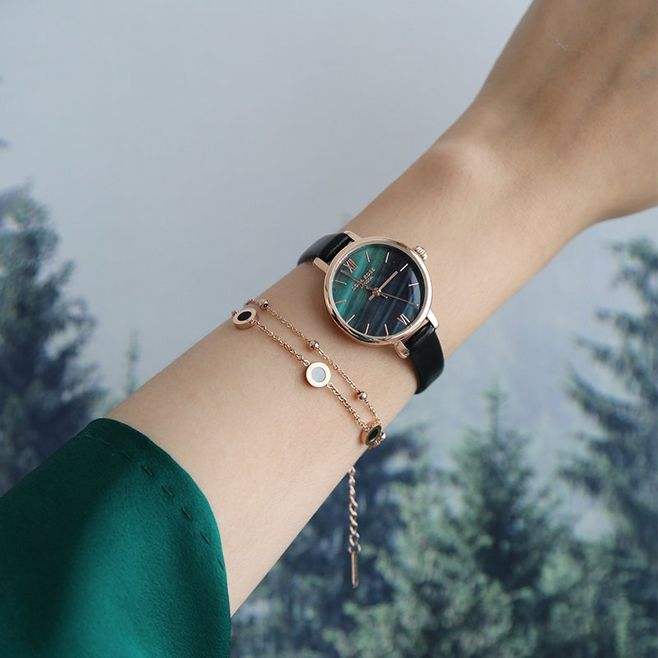 腕带有一点复古的绿色,一种久违的放松和宁静,美丽的手腕通勤外观诠释了新绿色的浪漫风格。渲染幸运、绿色、现代和复古手腕之间的碰撞。精选意大利优质腰带,柔软、精致,佩戴舒适。表壳由316L不锈钢制成,镜面由直径24毫米的矿物强化玻璃镜面制成。