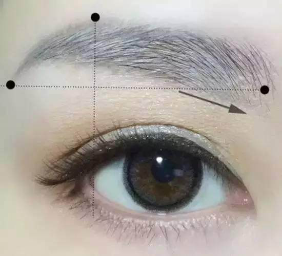 第一步:比拟桃花眉,拱形眉的弧度崎岖比拟大,眉尾最低点和眉头的下三分之一在一条线上,别的为了添加角度感,用眉笔顺着箭头标的目的画到眉头。