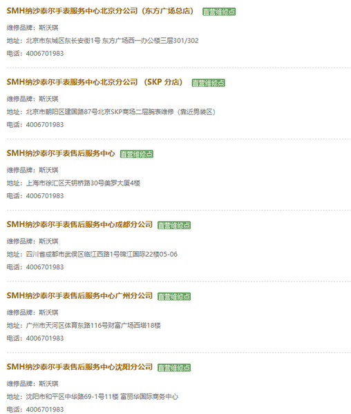 不管我们通过什么渠道购买到的手表,只要是正品,包装内都是有一个保修卡,还有一个厚厚的说明书,我们直接通过保修卡就可以看到400电话,还有周边的一些维修信息。其中也会包括斯沃琪手表维修点,但是如果是之前购买的手表,可能维修点还没有更新,老款上就没有相应的维修点,那么我们就需要特别注意好提前拨打电话,确定一下维修点的情况。