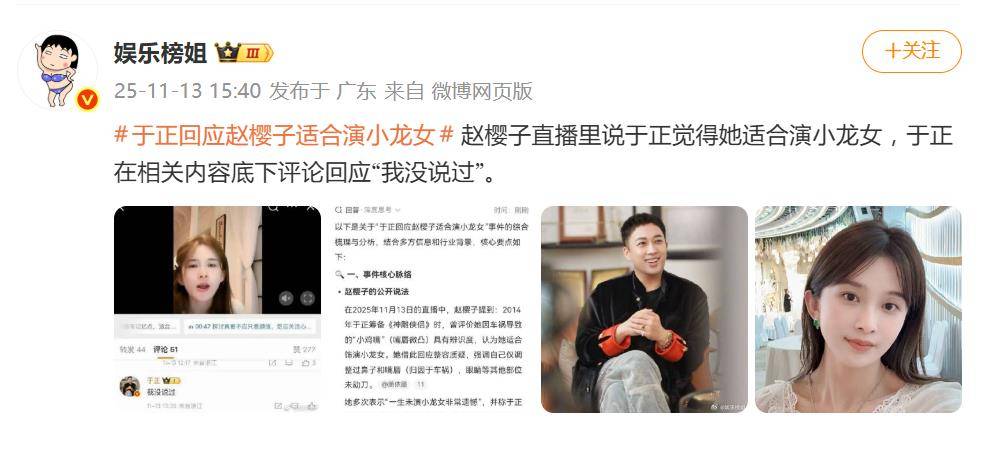 然而,赵樱子的“知遇之恩”并未持续太久。随着这一言论在网上发酵,于正本人迅速在微博评论区做出回应,只用了简短的三个字:“我没说过。”这反应既直接又坚决,没有丝毫含糊,也引发了网友们的热烈讨论。到目前为止,赵樱子并未对于正的否认作出任何解释,网络上的质疑声也愈发高涨。