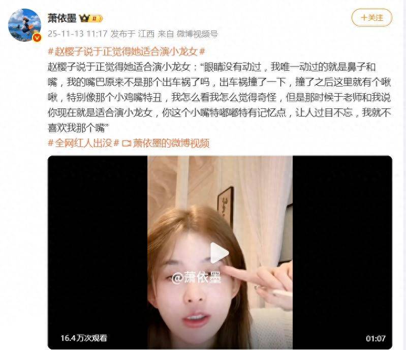 根据11月13日网友的报道,事件起源于赵樱子的一次直播互动。当时,她坦言自己动过鼻子和嘴巴的整形手术,并提到了于正。赵樱子绘声绘色地讲述,她因车祸留下的嘴唇问题,让她耿耿于怀,像“小鸡嘴”一样。但她表示,正是于正看到了其中的独特美感。她转述于正的原话称:“你现在适合演小龙女,你这小嘴嘟嘟的,很有记忆点,令人过目不忘。”这一番话,似乎为她自己找到了一个时尚的“权威背书”。