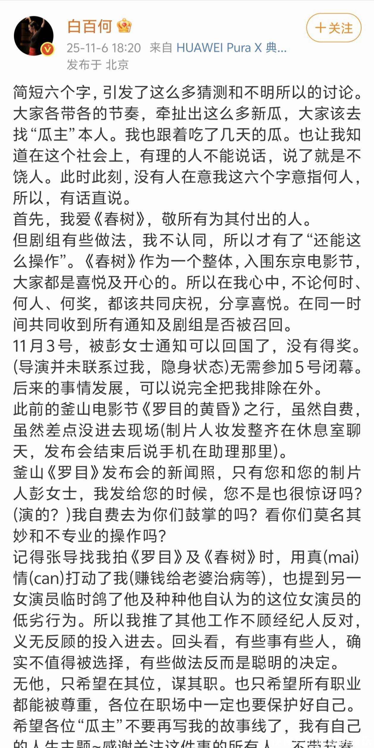 她首先明确表示,自己对春树剧组的感情是非常深厚的,她对所有为这个剧组付出努力的工作人员表示敬意。尤其是剧组能够入围东京电影节,她感到非常高兴,也为此感到自豪。然而,尽管对剧组的工作充满感激,但她对一些操作和做法有不同的看法,这也是导致她当时发出“还能这么操作”那六个字的根本原因。白百何特别强调,这六个字并不是针对男主王传君,而是针对导演张律和制片人彭女士,她对他们的不满由来已久。