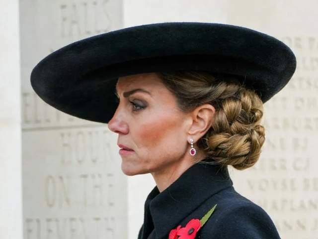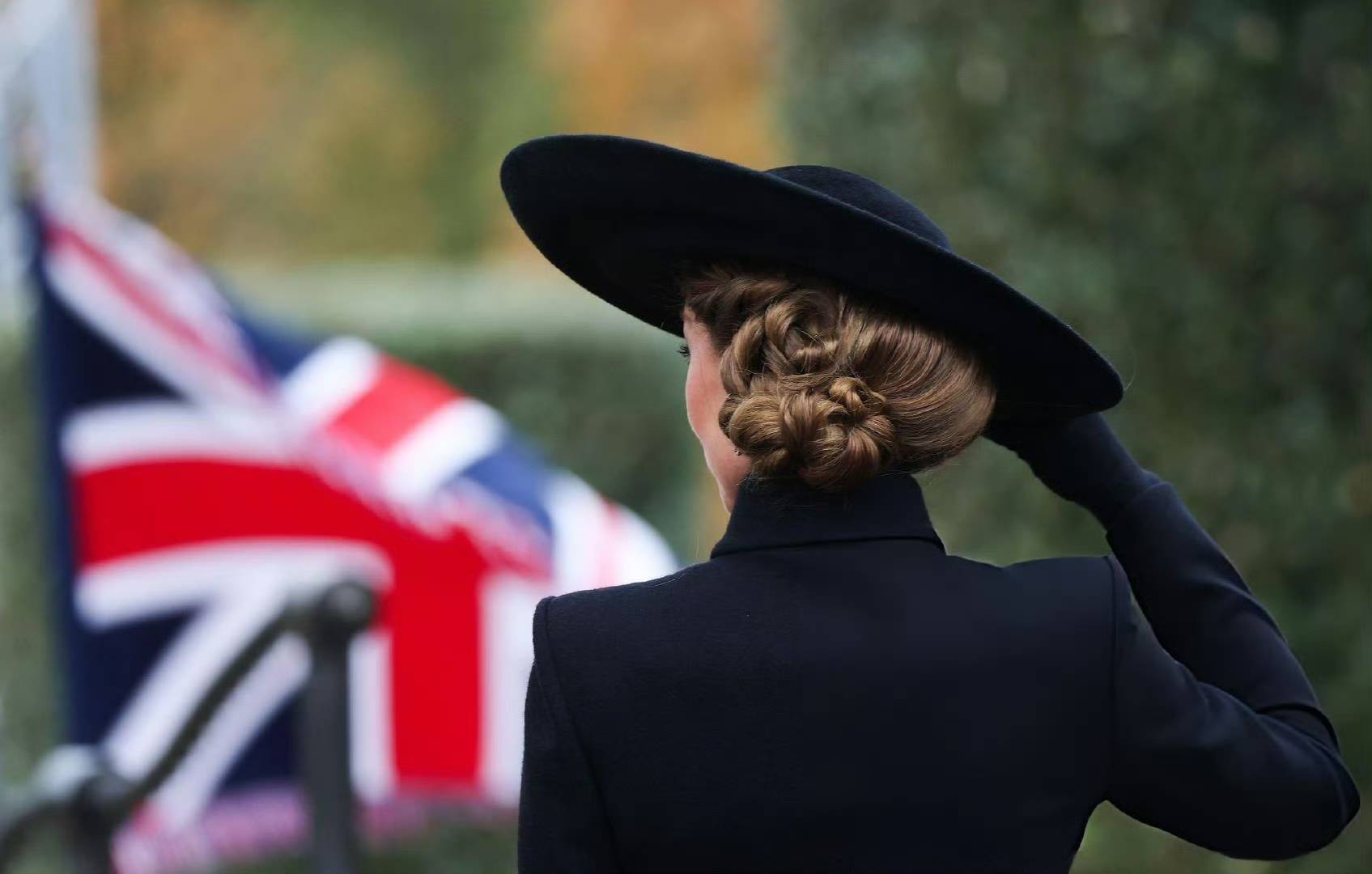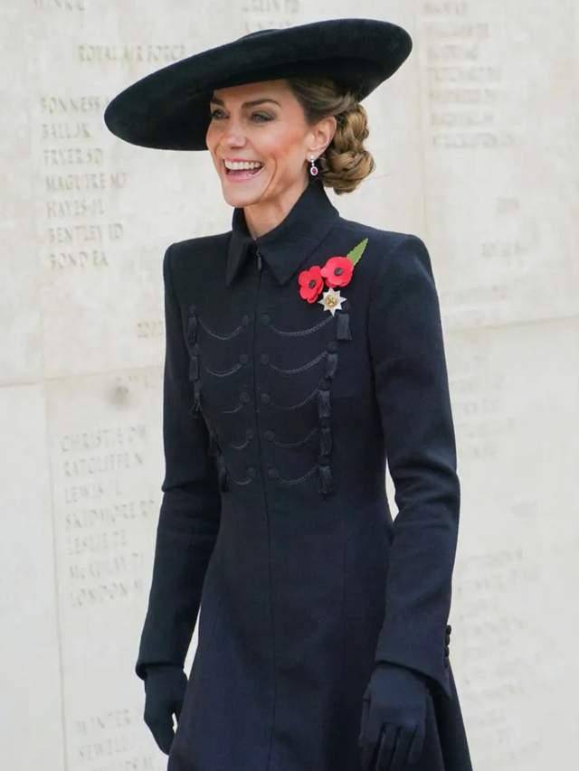 凯特王妃的这件黑色大衣,曾在2019年和2023年的阵亡将士纪念日上两度亮相,具有强烈的军事风格,尤其引人注目。她还巧妙地搭配了Gianvito Rossi的靴子、Cornelia James的手套,以及一顶宽大的Jane Taylor capeline帽,整体造型庄重典雅,完美契合这个纪念活动的氛围。