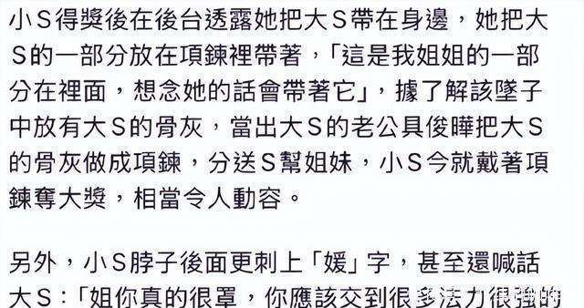 她还在接受媒体采访时,特意展示自己脖子上的项链,宣称这条项链让她时时感受到姐姐的陪伴。原来,这条项链是具俊晔亲手设计的,里面放着大S的骨灰。到了这一步,情况已经相当离谱了,几乎无法用“姐妹情深”来解释。更令人震惊的是,这条项链并不是独一无二的,居然还送给了大S生前关系亲近的朋友们,包括阿雅、范晓萱、吴佩慈等人。将亲人的骨灰当作纪念品送给别人,这样的做法实在令人难以理解。