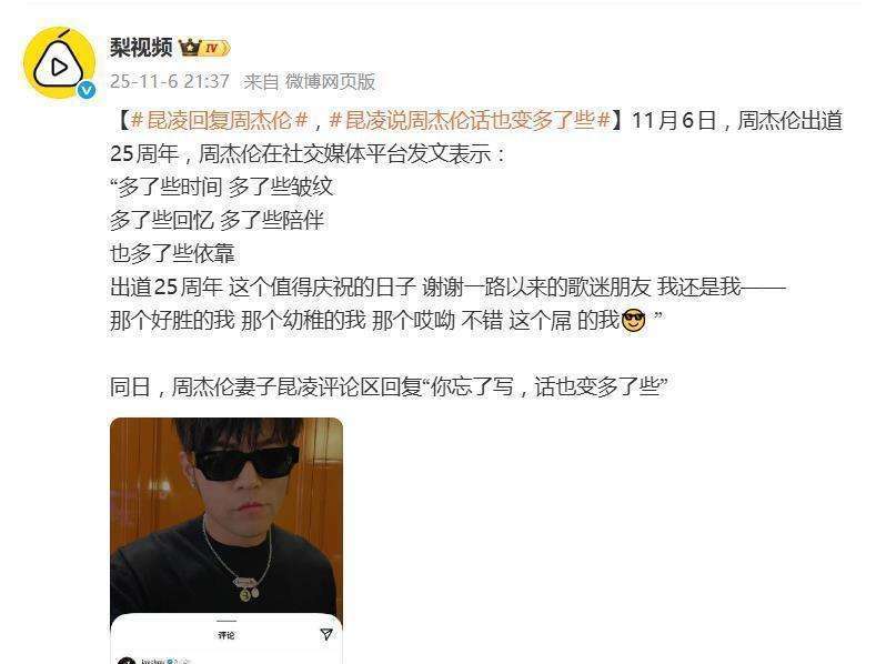 11月6日,周杰伦发布了一篇感人的长文,庆祝自己出道25周年。文章里,他分享了与音乐、事业和粉丝的心路历程。没想到,这篇文章引起了粉丝的热烈反响,但真正让话题引发全网的,却是妻子昆凌在评论区的一句幽默调侃:“你忘了写,话也变多了些。”