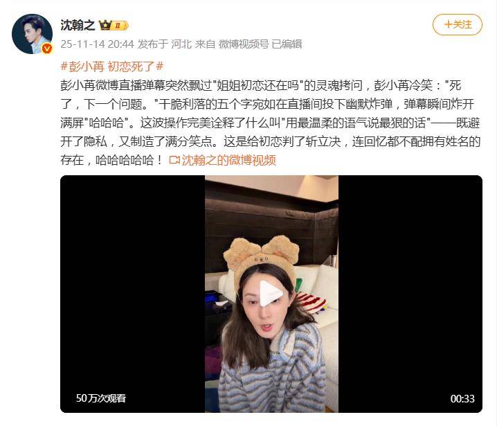 在11月14日的直播中,当直播弹幕跳出一条令人尴尬的提问:“姐姐初恋还在吗?”彭小苒眉头轻挑,嘴角带着冷笑,毫不犹豫地回应:“死了,下一个问题!”她简短直接的回答迅速化解了尴尬,满屏瞬间被网友的“哈哈哈”刷爆。这一波干脆利落的“斩立决”式回应,连回忆的余地都没有,简直像是用最甜的面容甩出了最狠的刀。网友们纷纷称她为“用最甜的脸甩最野的刀”,这一刻,她的幽默感再次炸裂。