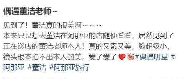 最近有位网友本来是去阿那亚打卡,想要去董洁的店看看,结果碰巧遇到了董洁本人正在店里巡视。网友立马拍了合影并激动地分享了出来,称董洁真的是美得令人惊艳。她的赞美之情溢于言表,但比起这些夸奖,更值得注意的其实是合影里那些未经修饰的细节。这些真实的细节展现了一个与荧幕上不同的董洁,45岁的她看起来更自然,充满了岁月的痕迹。