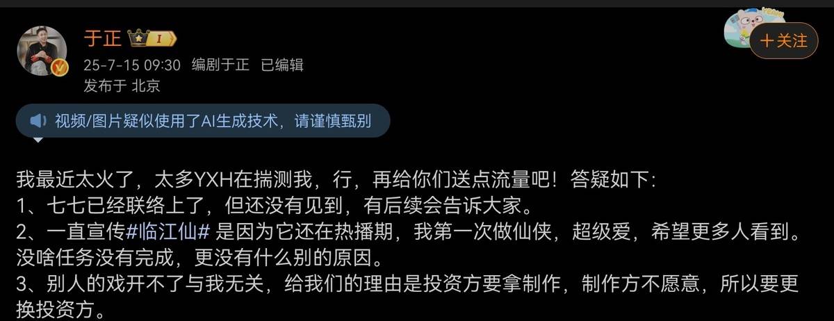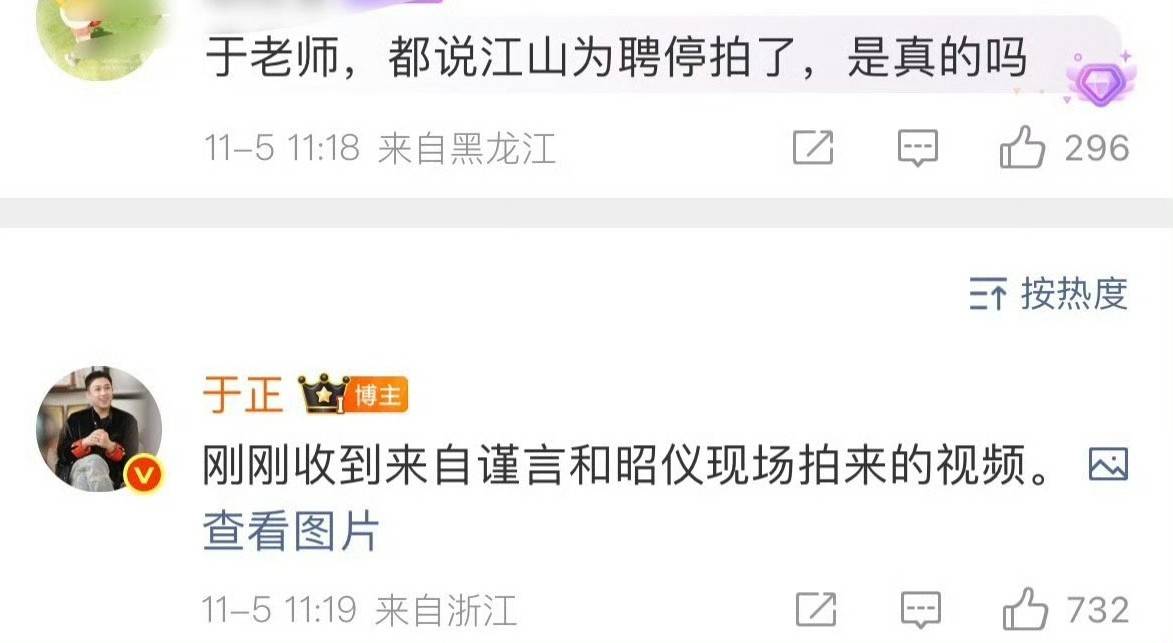 不过,尽管面临重重困难,《江山为聘》依然通过不断的招商和调整,继续坚持拍摄。直到11月初,剧组的停拍消息再次被曝出,网友纷纷跑到于正的评论区留言询问情况。作为娱乐圈的知名人物,于正的一言一行总能引发热议。当他看到网友关于是否停拍的提问时,他并没有直接回答,而是通过晒出吴谨言和赵昭仪在片场拍摄的视频,间接地否认了停拍的传闻。