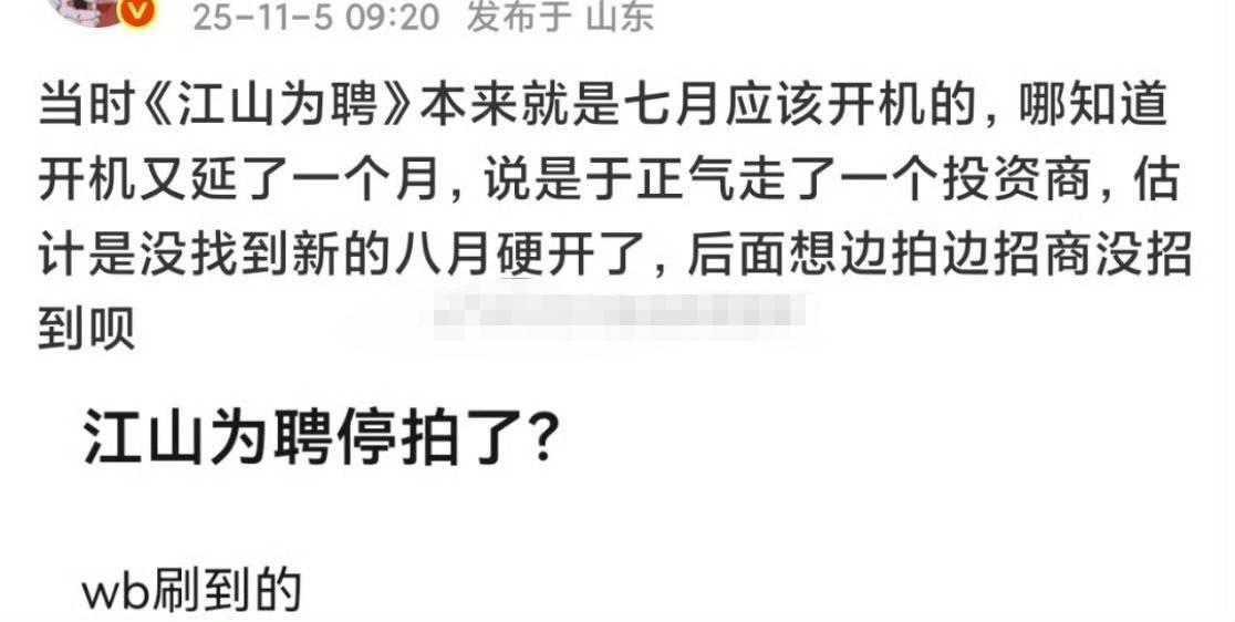 有知情人士透露,《江山为聘》已经停拍,是否恢复拍摄仍未可知。更让人担忧的是,早在7月中旬,便有瓜主透露,剧集的幕后投资人已经跑路,导致制作方和投资方的信任危机加剧。于正作为该剧的编剧,紧急发布声明撇清关系,声称自己并不关心剧集是否能够继续进行,反而表示自己正在与投资方沟通,希望尽可能避免负面影响。