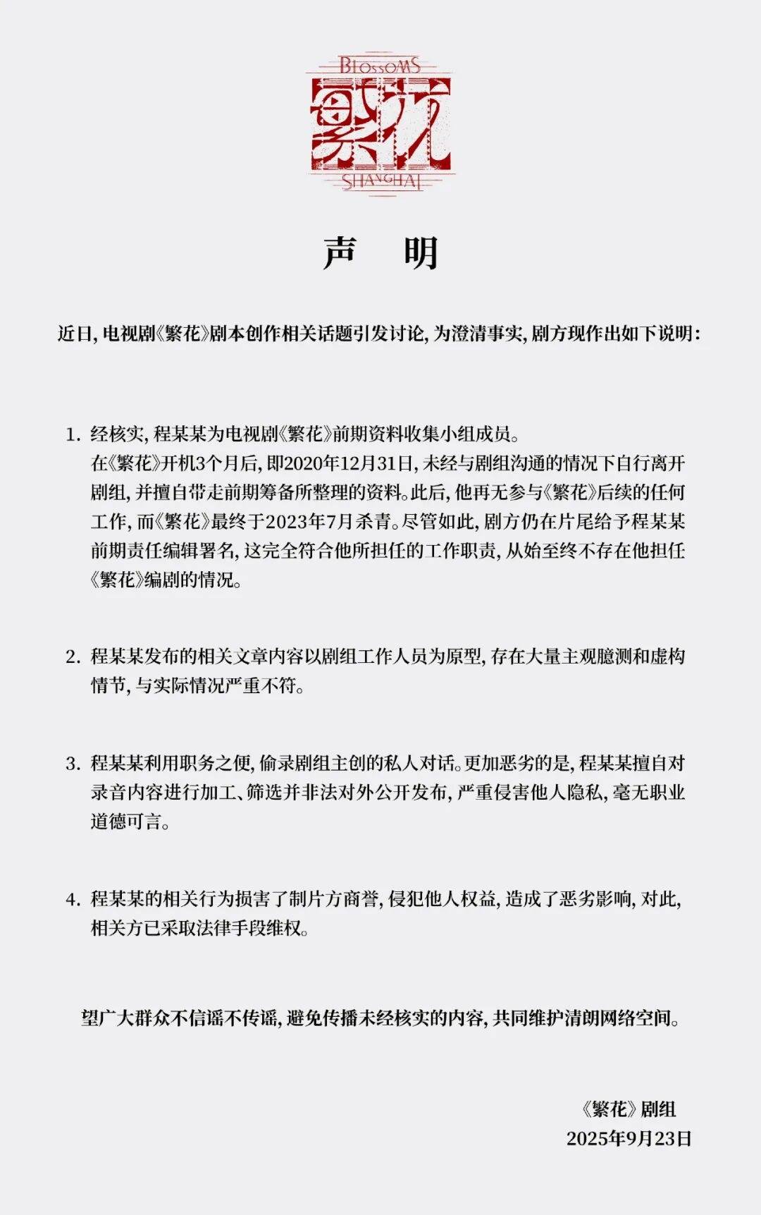 古二录音中的一段内容,提到一名月薪三千的编剧,在完成了编剧和助理两重角色后,仍然无法获得署名的情况,这种全程参与创作却始终被剥夺认同的困境,让不少同行感同身受。然而,直到今天,除了《繁花》剧组曾发布过“回到国内合理合法维权”的声明,几乎没有任何知名编剧敢于公开表态。