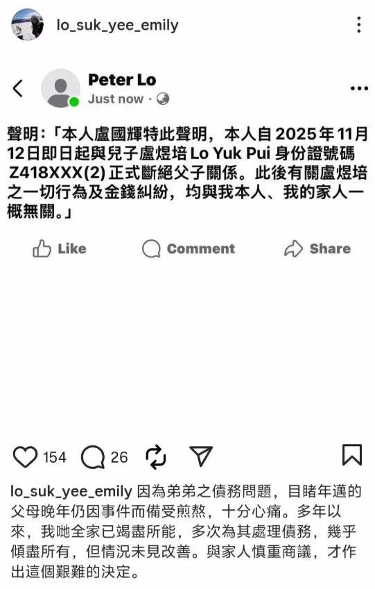 终于,卢淑仪的父亲卢国辉实在忍无可忍,公开声明决定与亲生儿子卢煜培断绝父子关系,并宣布从此之后,卢煜培的行为将与卢家毫无关系。对此,卢淑仪也首次发声,表示自己对弟弟的行为感到深深的痛心与失望。