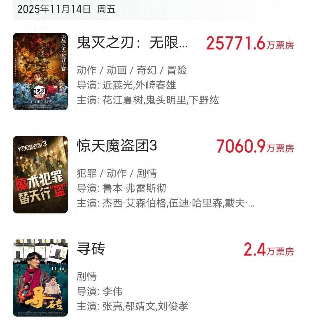 紧随其后的是好莱坞大片《惊天魔盗团3》,这部全球知名IP的续集自然吸引了不少关注。然而,尽管拥有不小的粉丝基础,其票房表现却未能令人满意,首日票房仅为不到5000万人民币,当前累计票房也仅略超7000万人民币,与《鬼灭之刃 无限城篇 第一章》相比,差距显而易见。