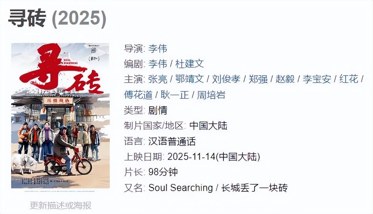 《寻砖》票房成绩不理想的原因,主要是影片的知名度和关注度不足,尽管演员阵容颇为强大,参演的多位明星都是观众熟悉的面孔。该片由周星驰的“星女郎”鄂靖文主演,其他演员还包括曾参演《爸爸去哪儿》的张亮、兼具颜值与实力的刘俊孝、国家一级演员郑强,以及在《雍正王朝》中饰演李卫的赵毅等知名人物。