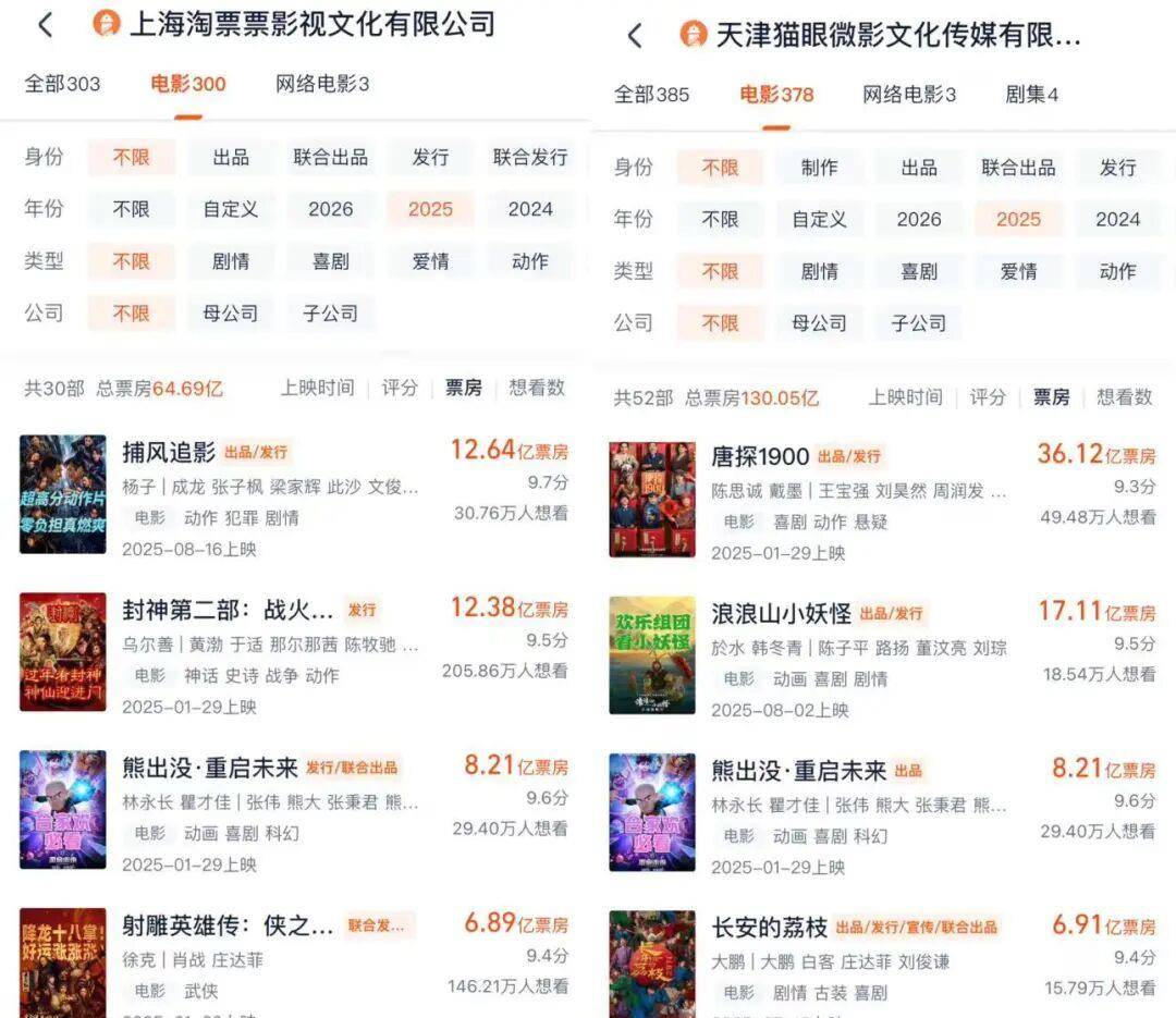 今年国庆档十部新片,猫眼主控五部,票房前三全部由其出品。淘票票同样不甘示弱,两大平台几乎包圆了优质电影的发行。