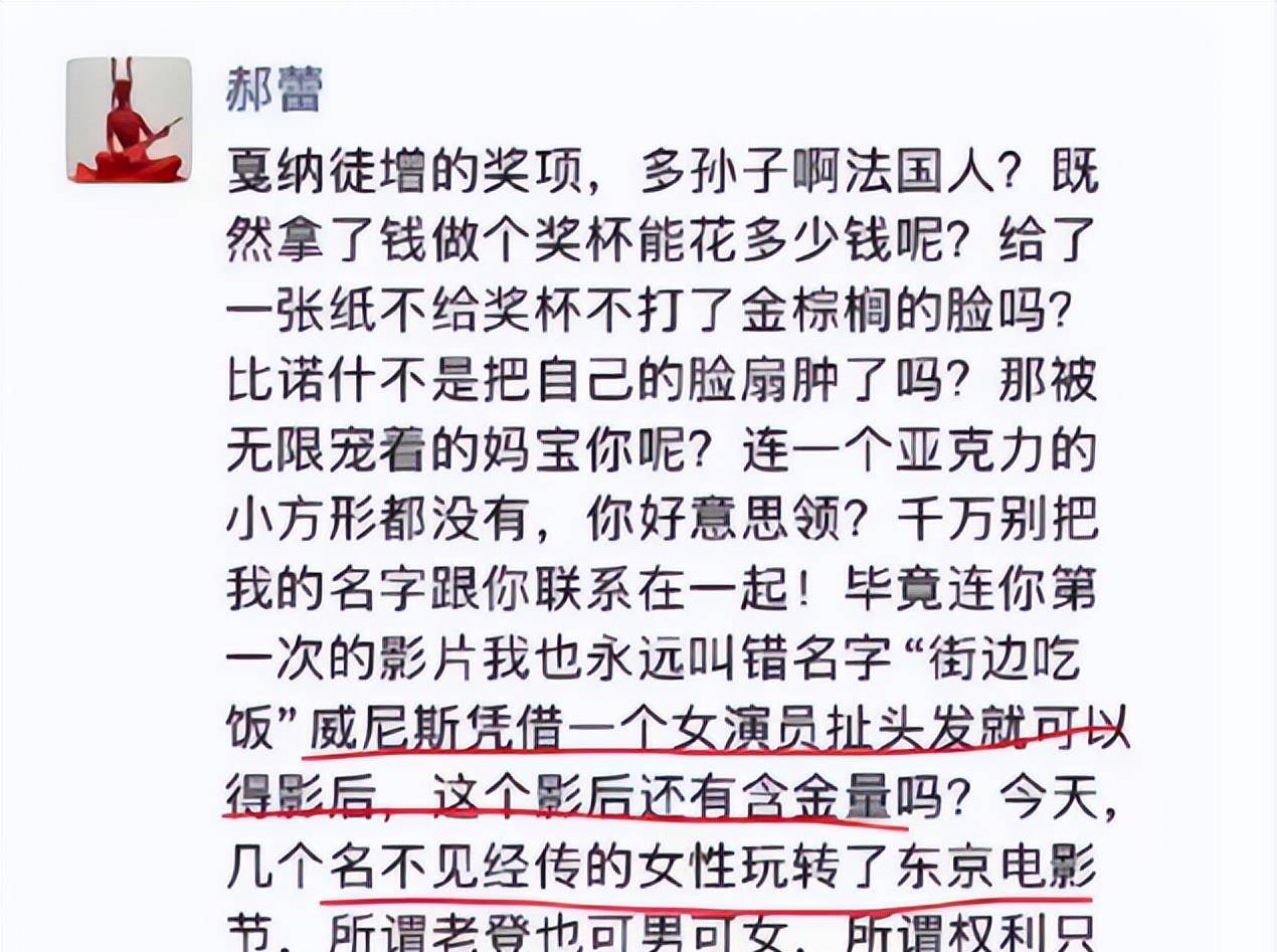 娱乐圈又炸锅了!这次不是小鲜肉恋爱塌房,而是老戏骨郝蕾直接掀了三大电影节的桌子!朋友圈长文疯传,字字诛心,句句爆雷,直接把戛纳、威尼斯、东京三大奖项的老底都掀了!