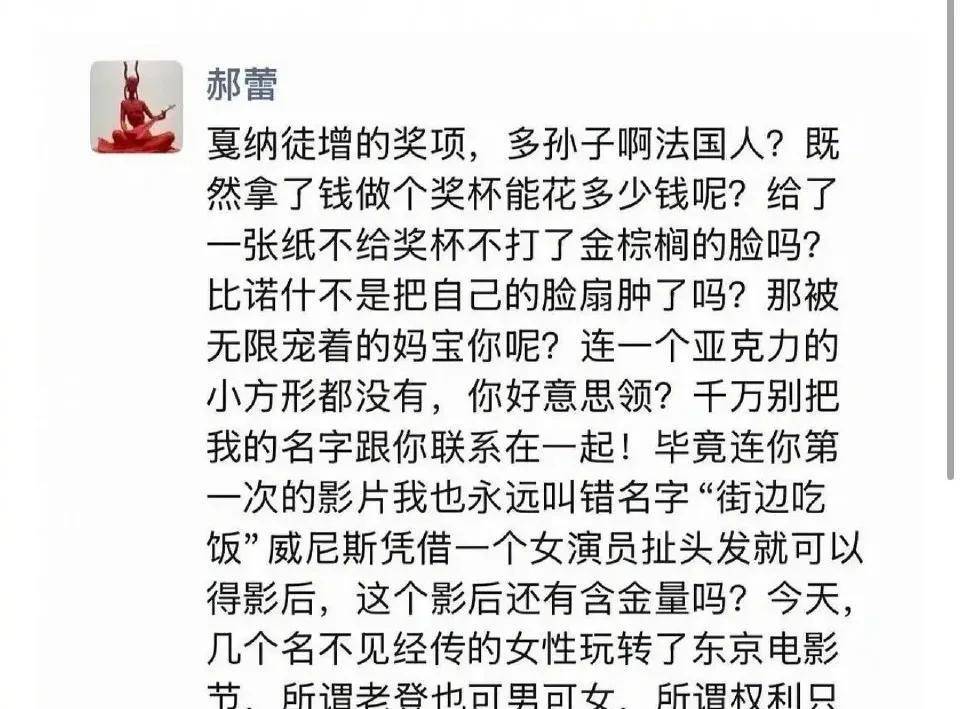 谁能想到,郝蕾一条朋友圈竟掀起滔天巨浪!那段话简直像在娱乐圈投下深水炸弹,直接把三个国际电影节的老底都给掀了: