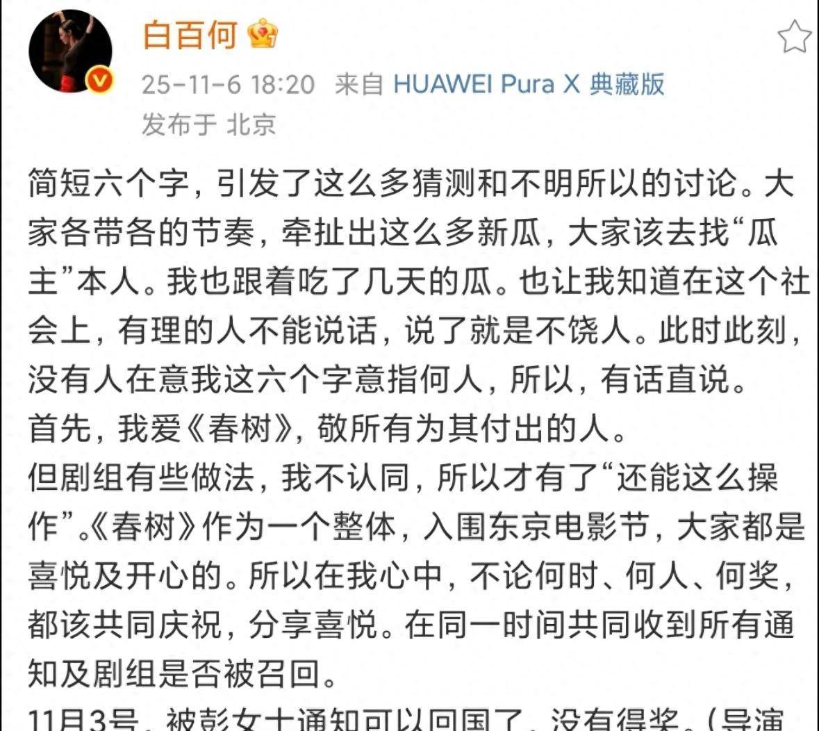 事情要从白百何那篇“火药味”十足的长文说起。她控诉自己在剧组遭遇区别对待,从酒店安排到奖项运作,字字扎心,瞬间引爆热搜!而就在昨晚,《春树》导演张律和制片人彭瑾终于坐不住了,一场独家对话,把这场罗生门的内幕一一摊开!