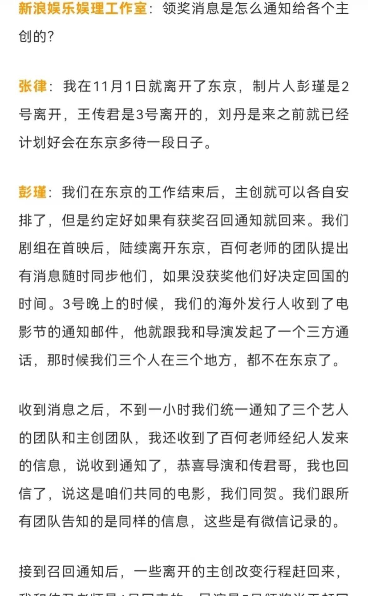 剧组澄清:11月3日晚接到获奖通知,一小时内就通知了三位艺人团队。而白百何经纪人还在微信上恭喜了导演和王传君!所以“被瞒着”的说法,从何而来?