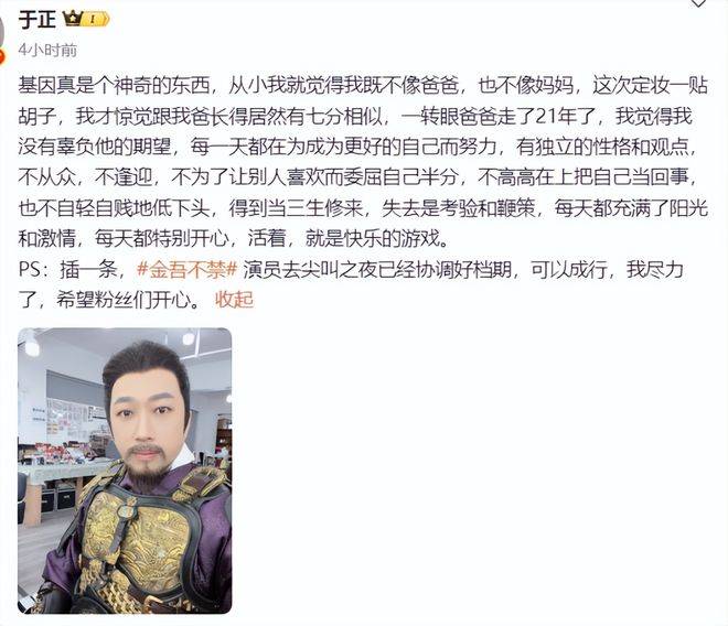 就在大家以为这场"造型闹剧"要以于正退演收场时,11月22日上午,他再次更新了定妆照——这次直接开启"全副武装"模式,头套、胡须、铠甲一个不少,还加了顶镶着红缨的头盔,站姿也特意调整得笔直,努力凹出将军的威严感。不过这次于正学聪明了,深知"先下手为强"的道理,没等网友开喷,就先甩出一篇千字小作文抢占舆论高地。文中他褪去了往日的犀利,字里行间都透着真情实感,感慨起基因的奇妙:"以前总觉得自己既不像威严的爸爸,也不像温柔的妈妈,一直很纳闷自己的长相是从哪来的。一晃眼父亲都走了21年了,昨天粘上胡须穿上戏服,从镜子里一看,突然发现自己竟有七分像他,连眉宇间的神态都一模一样,当时鼻子就酸了。"