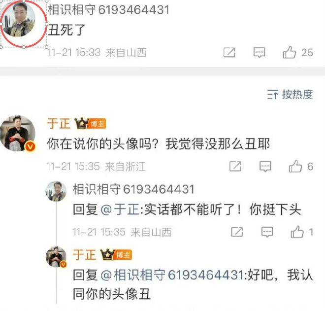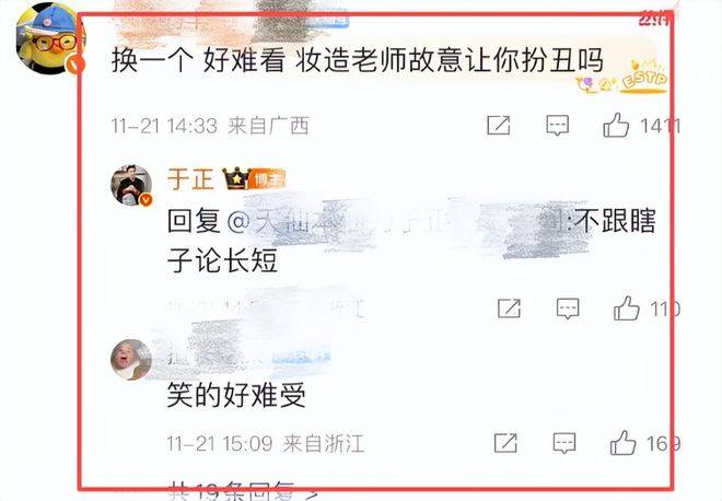 更有网友把玩梗玩到了"天花板"级别,直接把自己的头像换成这张金甲照,昵称改成"沈杰将军本军",专门跑到于正评论区留言"丑死了,建议原地卸甲",主打一个精准"碰瓷"。这下可彻底把于正惹急了,作为常年在网上舌战群儒的"资深辩手",他哪能忍这种"挑衅",当即撸起袖子加入战局:"我觉得挺精神的啊,没那么丑吧!"结果网友丝毫不给面子,怼得一针见血:"于老师听句劝,自信是好事,但别盲目自信,真的有点下头了。"你来我往几个回合后,于正看着越来越多的吐槽留言,气势渐渐弱了下来,最终服软认栽:"行吧行吧,你们说丑就丑,我认同还不行嘛。"没过多久,这张命运多舛的铠甲照就被悄悄删除,从发布到撤回连两小时都不到,网友调侃他创造了互联网"明星定妆照最快撤回记录"。