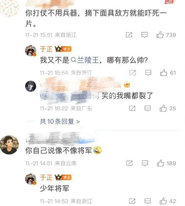 有网友实在看不下去,直言不讳地建议:"于老师赶紧换造型!这妆造还不如我奶奶给我扎的红头绳精致,妆造老师是故意跟你有仇吗?"于正嘴硬心软,回怼时还留了点余地:"不与瞎子论长短,懂欣赏的自然懂。"面对"笑得好僵硬""丑出天际"的犀利嘲讽,他干脆开启"自我安慰模式",甩锅式回应:"你们就是嫉妒我能演将军,嫉妒我有这么好的资源!"最绝的是有位网友的神调侃:"沈将军上战场根本不用带兵器,直接摘了头盔露个脸,就能把敌军吓得掉头就跑,比核武器还管用。"这话倒是把于正逗乐了,难得谦虚了一回:"我又不是兰陵王,哪有这么大的'杀伤力',人家兰陵王是帅到戴面具,我这是怕吓着人啊。"看到有网友放话"要给所有吐槽你的评论点一遍赞",于正更是开启"反杀"模式,嬉皮笑脸地回复:"谢谢这位朋友捧场,这流量我就收下了,正好给新剧预热!"