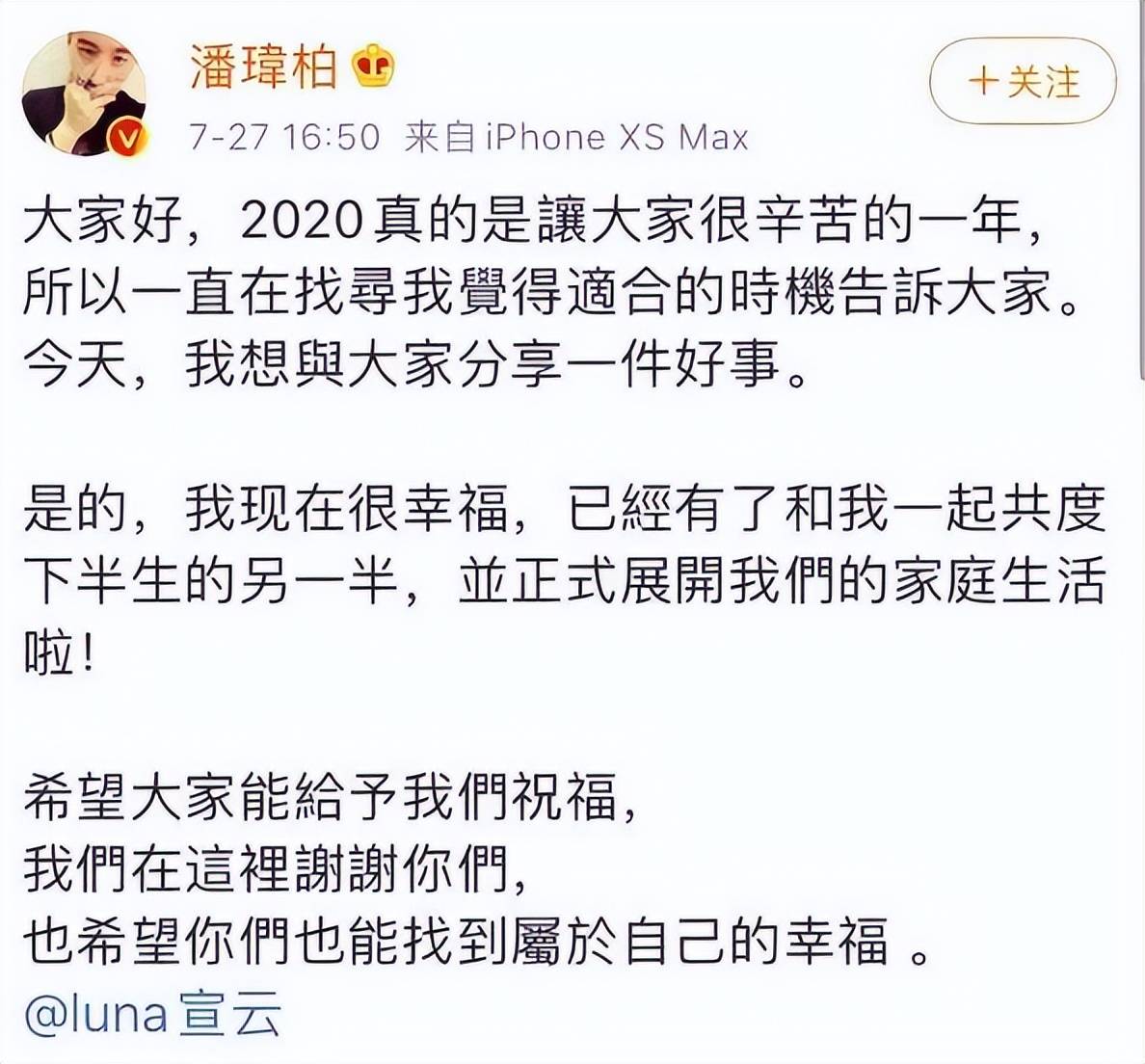2026年7月,潘玮柏在个人社交平台上宣布一张亲密合影。