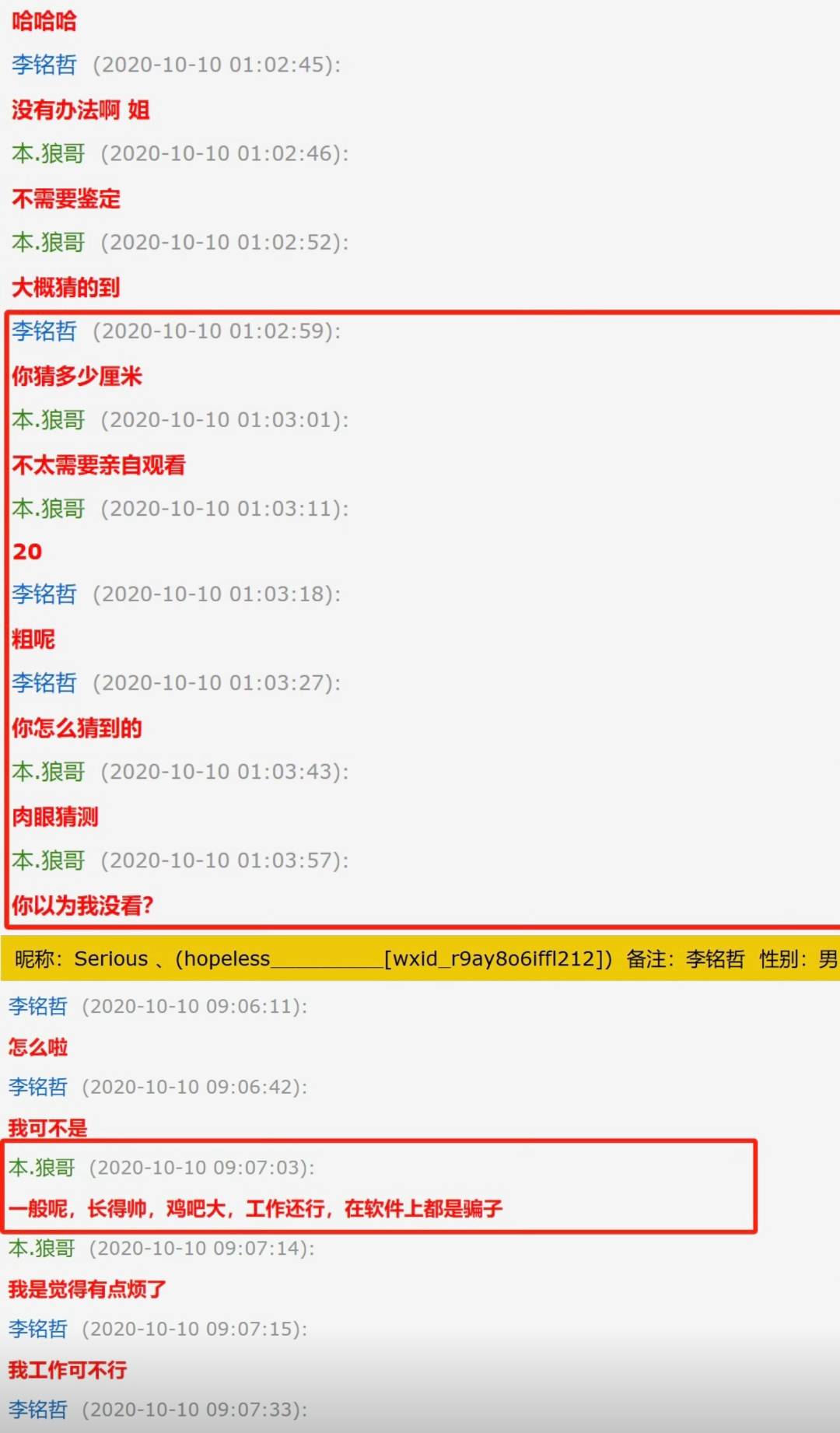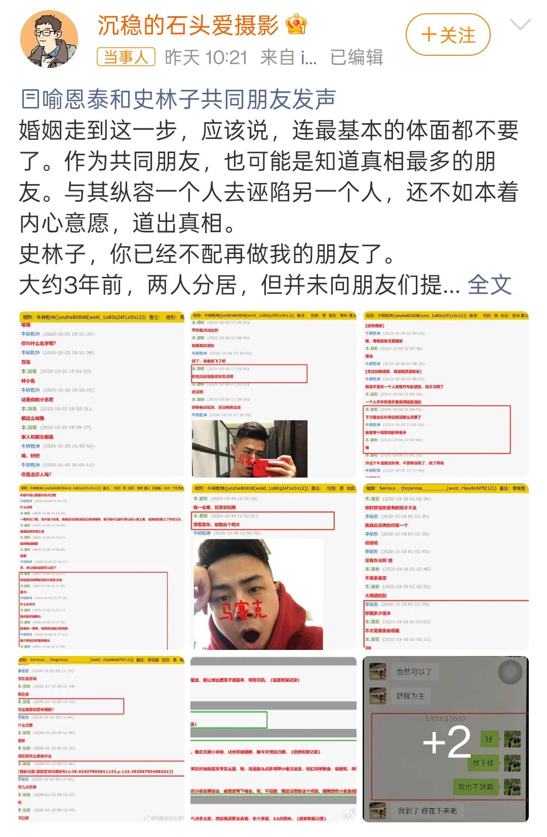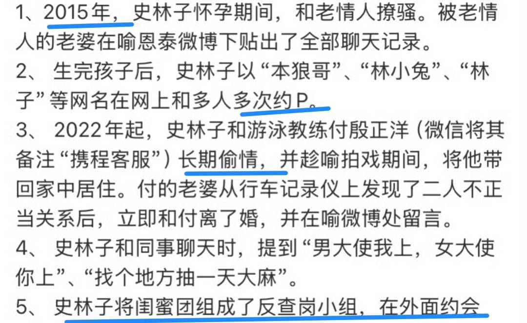 就在舆论开始质疑喻恩泰人品时,剧情却突然反转。一位喻恩泰与史林子的共同好友公开长文,并附聊天截图,力证史林子才是生活中不守妇道的一方。这些截图显示,史林子疑似以“本狼哥”网名,先后与两位男网友保持暧昧关系。据爆料,该行为从十年前就开始,涉及约会与教练不当交流,并有大量证据可查。