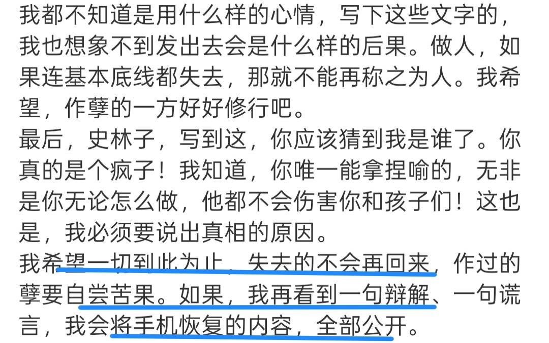 首先,看双方爆料方式。喻恩泰依靠朋友发布消息,揭露史林子在私人生活中的不检点,但所谓证据大多停留在口头“聊骚”,并无实质证据。同时,爆料文末带有明显的“威胁”和“谈和”意味,即双方最好各退一步:史林子不再爆料喻恩泰,否则就会放更多截图抹黑她。相比之下,当年王宝强发现妻子与经纪人不正当关系后,第一时间发布正式声明,解除婚姻并依法追责。这种正大光明的反击,让背叛者无话可说,也体现出王宝强坦荡的心态,既不畏惧对质,也无意威胁或操控对方。