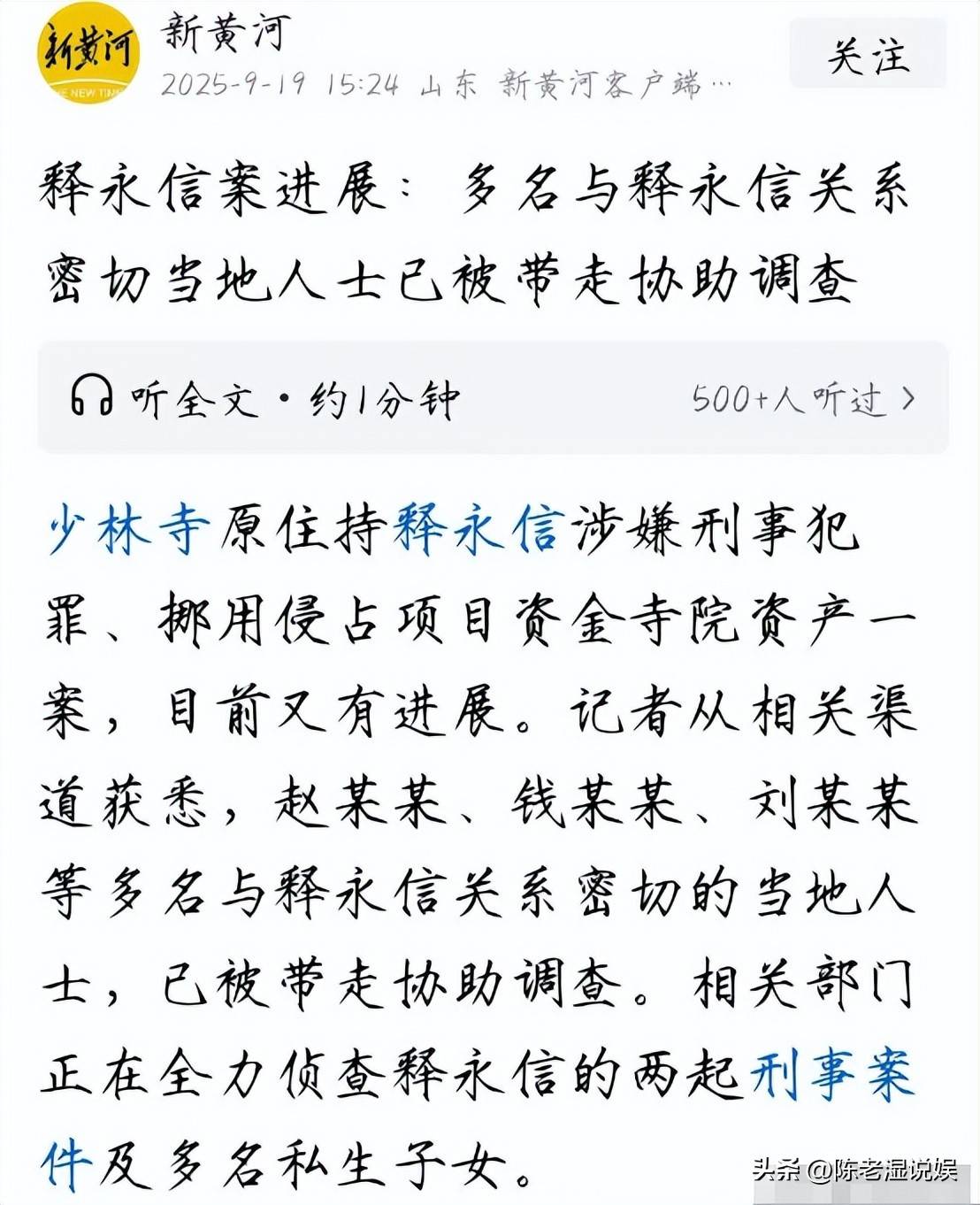 这说明关于释永信的调查范围广,牵扯深。