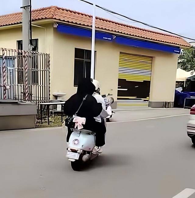 而坐在电动车前座的妹妹便有些害羞和内向,不好意思地低下了头。