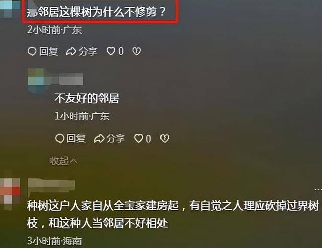 但是也有一些网友认为:“邻居早就应该把树砍掉,树枝伸过来多少就可以砍多少,我的地盘我做主!”