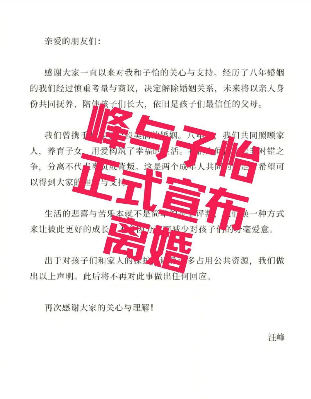 不久后,汪峰在章子怡的生日派对上求婚成功,两人正式步入婚姻殿堂。婚后,章子怡为汪峰生下一个女儿,并通过社交平台公开喜讯。两人在网络上频频秀恩爱,章子怡还为汪峰生下了一个儿子,似乎一切都在朝着幸福的方向发展。然而,这段看似美满的婚姻却突然宣告结束,汪峰与章子怡共同发布了分手声明。