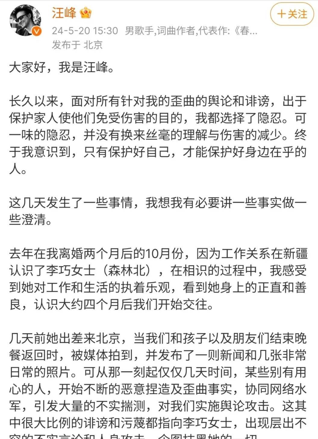 2023年,汪峰再次引发媒体关注,当网友发现他已有新恋情时,不少人猜测他在与章子怡离婚前便与别人保持关系。直到520这天,汪峰终于在社交平台上承认与李巧的恋情,称这段关系是在离婚六个月后开始的,澄清了此前的流言蜚语。