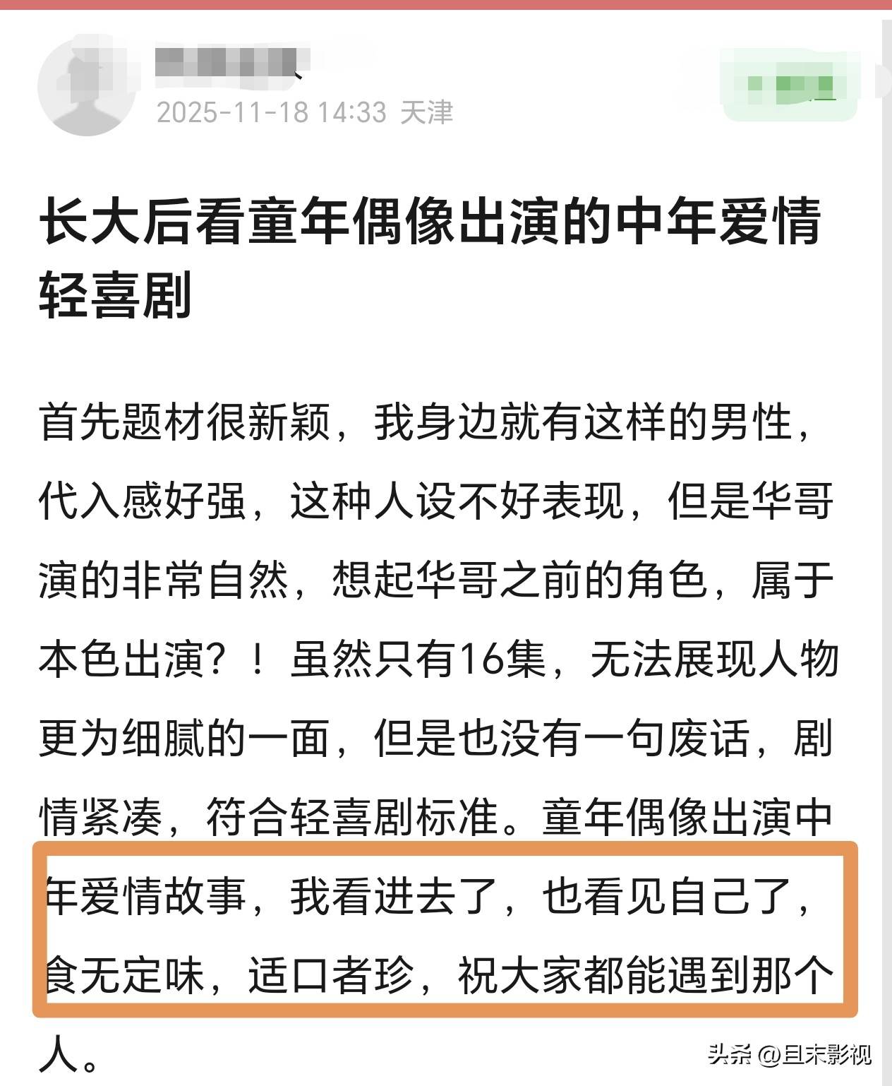 在这些表扬主演的评论之后,剧情自然也没被忽视。有网友评价道:这部剧讲的是中年爱情故事,看得人很入戏,“食无定味,适口者珍”。这句话无疑是对剧情最真实、最中肯的评价。