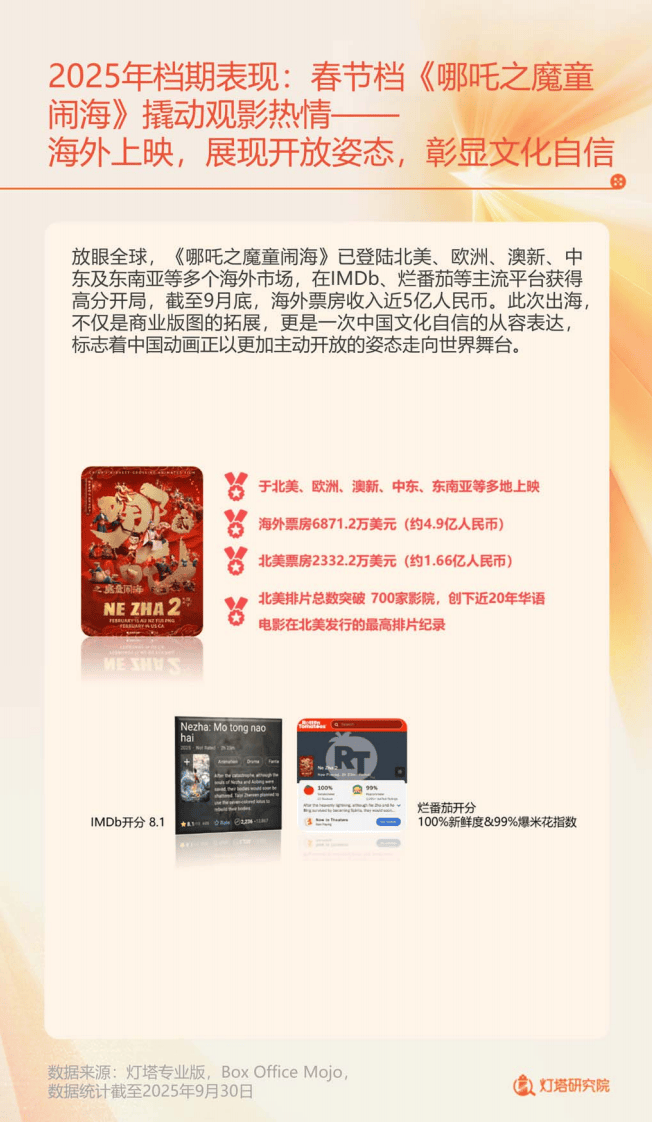 市场表现上,动画电影成为最大亮点,《哪吒之魔童闹海》以154.46亿票房创下影史纪录,不仅拉动春节档观影人次达3.24亿,还推动国产动画观众喜爱度提升5%,带动《浪浪山小妖怪》《罗小黑战记2》等作品持续走红。暑期档表现亮眼,以《南京照相馆》为首的头部影片淘票票评分均超9分,豆瓣评分逾7.5分,成为近五年口碑最佳暑期档。此外,国产电影在观众偏好度上已追平好莱坞电影,32%的观众更倾向于国产电影,65%的观众增加了国产电影观看频率。
