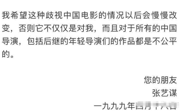 张艺谋丝毫没有妥协,既然你不尊重中国电影,那咱就不陪你玩了,直接奉上一封决裂信。