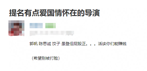 此事也算热度退潮,最近大家挨着盘了一圈国内导演,发现虽然表现形式不尽相同,但很多导演还是很有爱国情怀的。
