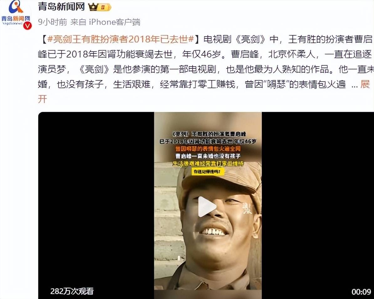 2018年,曹启峰在北京某医院病逝,享年不惑。他在《亮剑》中只有三分钟的镜头,饰演王有胜一角,然而那段“王有胜阅兵”的戏,却成为B站鬼畜视频中的顶流经典。曹启峰是群演出身,拍摄《亮剑》时仅拿到每天60元的片酬,却依然用自己的积蓄买了两双军布鞋,其中一双在拍摄爆炸戏时被磨破,另一双却舍不得穿下。对于许多群演而言,想要被观众记住是极其困难的,曹启峰凭借这三分钟的出色演绎,让观众记住了他,这份成就值得每个人为之尊敬。