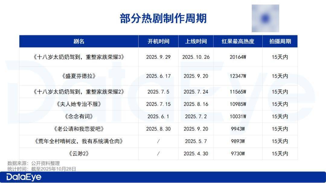 10月26日《十八岁太奶奶驾到,重整家族荣耀3》开播,27日红果热度突破2亿。除去前期筹备的时间,从开机到上线,仅用了1个月,可谓是速拍速剪速火的典型代表。从数据看,快节奏制作在一定程度上让部分短剧作品吃到了“时间红利”,但也让“品质天花板”的讨论从未停歇。