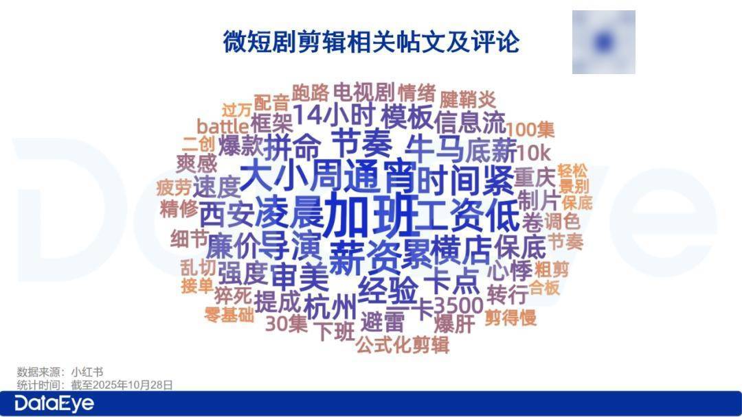 DataEye短剧观察抓取了5000条与“微短剧剪辑”相关的帖文及其评论,剔除掉招聘广告类的帖文,相关词条约2500条。透过这些讲述,我们看到了剪辑师群体的真实生存写照。