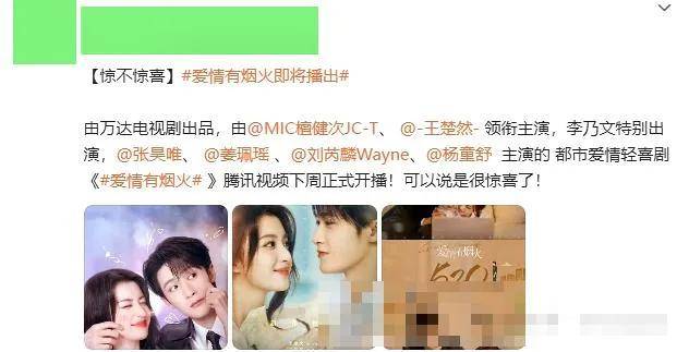 而最近我听说一部叫爱情有烟火的剧集要开演了!它不仅是一部剧,更像是一杯精心调制的鸡尾酒,令人一饮倾心,回味无穷。主角阵容和预告我偷偷瞄了一眼,马上变成死忠粉,就等开播敲钟了,你信我,这部剧不熬夜也要追。