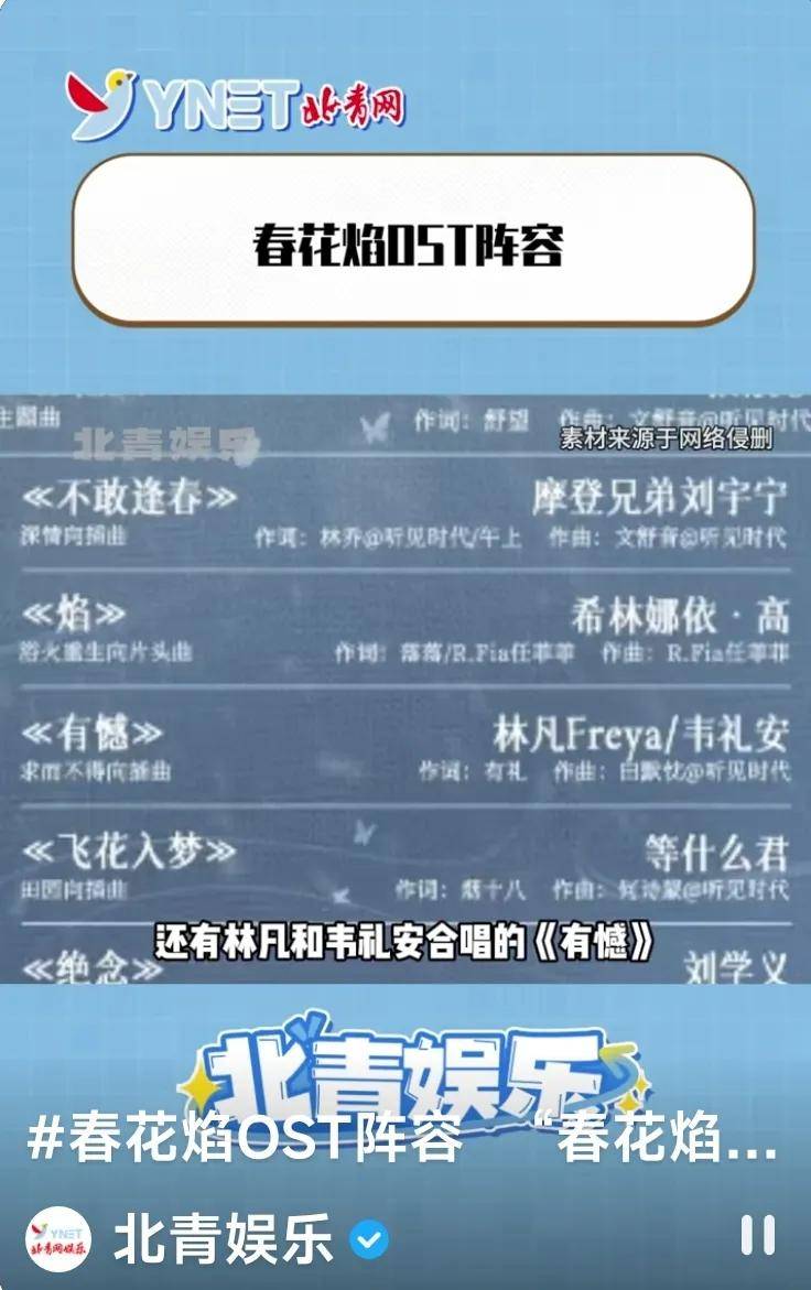 在这个充满惊喜与期待的娱乐圈,每当有新的影视作品公开其相关阵容,总是能引起粉丝和观众们的热烈关注。就在11月1,电视剧春花焰重大公开了其OST阵容,这一消息如同投入平静湖面的巨石,瞬间激起千层浪,让整个娱乐界都为之沸腾。