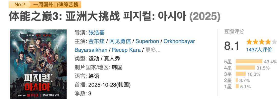 《体能之巅》第三季目前在豆瓣上的评分为8.1分,反响不小。整个节目汇集了来自八个国家的选手,分别是韩国、日本、泰国、蒙古、土耳其、印尼、澳大利亚和菲律宾。每个国家派出了六名最强选手,共计48人,进入了为节目特别打造的巨型竞技场。
