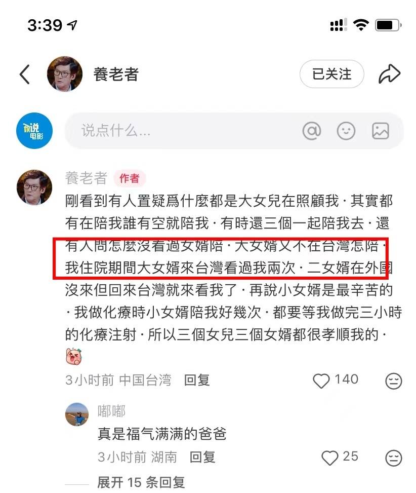 女婿不同儿子,又不是亲生的,只有小女婿一个在台北,所以小女婿陪伴老岳父要多一些,做化疗也是小女婿去陪伴更多,所以现在郭碧婷带着爸爸去看医生,姐妹之间都好说好商量吧?
