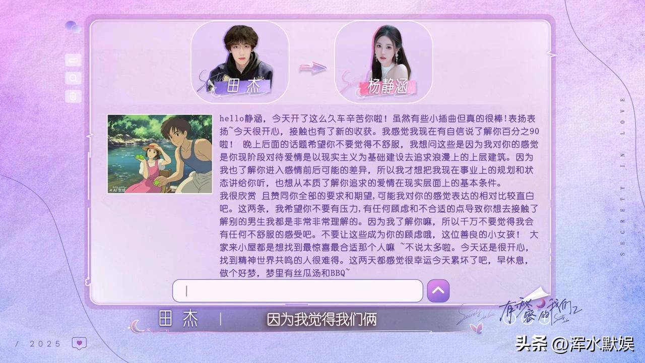 随着时间的推移,田杰在与杨静涵的互动中逐渐对她产生了感情。我原以为他们两人在节目中肯定会发生冲突,因为从表面上看,他们似乎是完全不同类型的人。但令人意外的是,最新一期节目让我对田杰有了全新的认识,甚至发现他是节目中最尊重女嘉宾的男生之一。以下几点足以证明这一点。