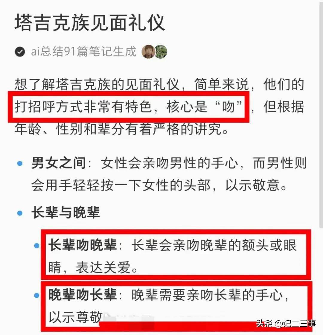 随后,一些塔吉克族的网友出来为大家科普,解释道,这种亲额头的礼节通常是用来表示长辈对晚辈的关爱,尤其是在成年异性之间,确实要特别小心和注意分寸。沙溢的“已婚好丈夫”人设让很多人对他的举动产生了疑问,不少网友表示:“沙爹平时挺懂分寸的,怎么突然变得这么‘上头’?”更有人调侃:“连徐志胜、郑恺都知道要和女生保持距离,沙溢怎么就这么投入了?”视频中的宋雨琦也明显有些抗拒,反应如此直接,让网友们的议论声不断升高。