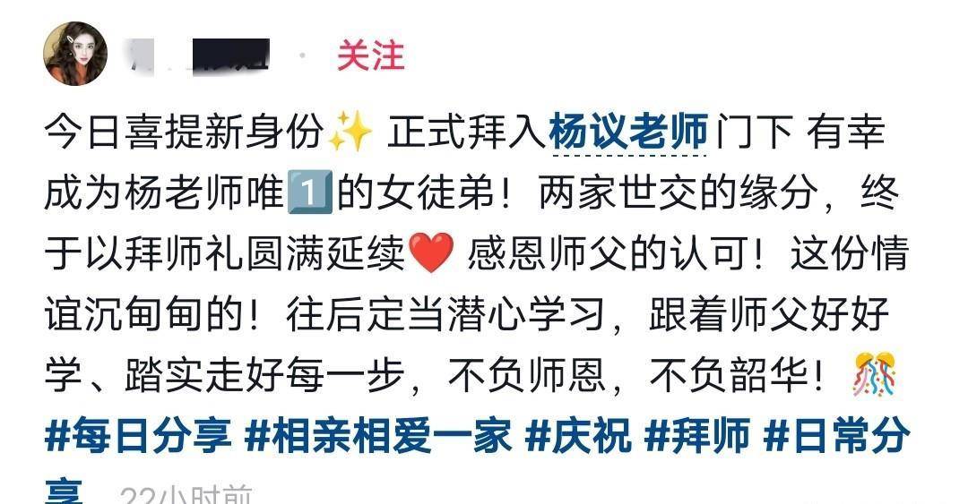 12月11日,杨少华的小儿子杨议收了一位女徒弟,这事儿对外 folks 来说,基本没啥大问题。